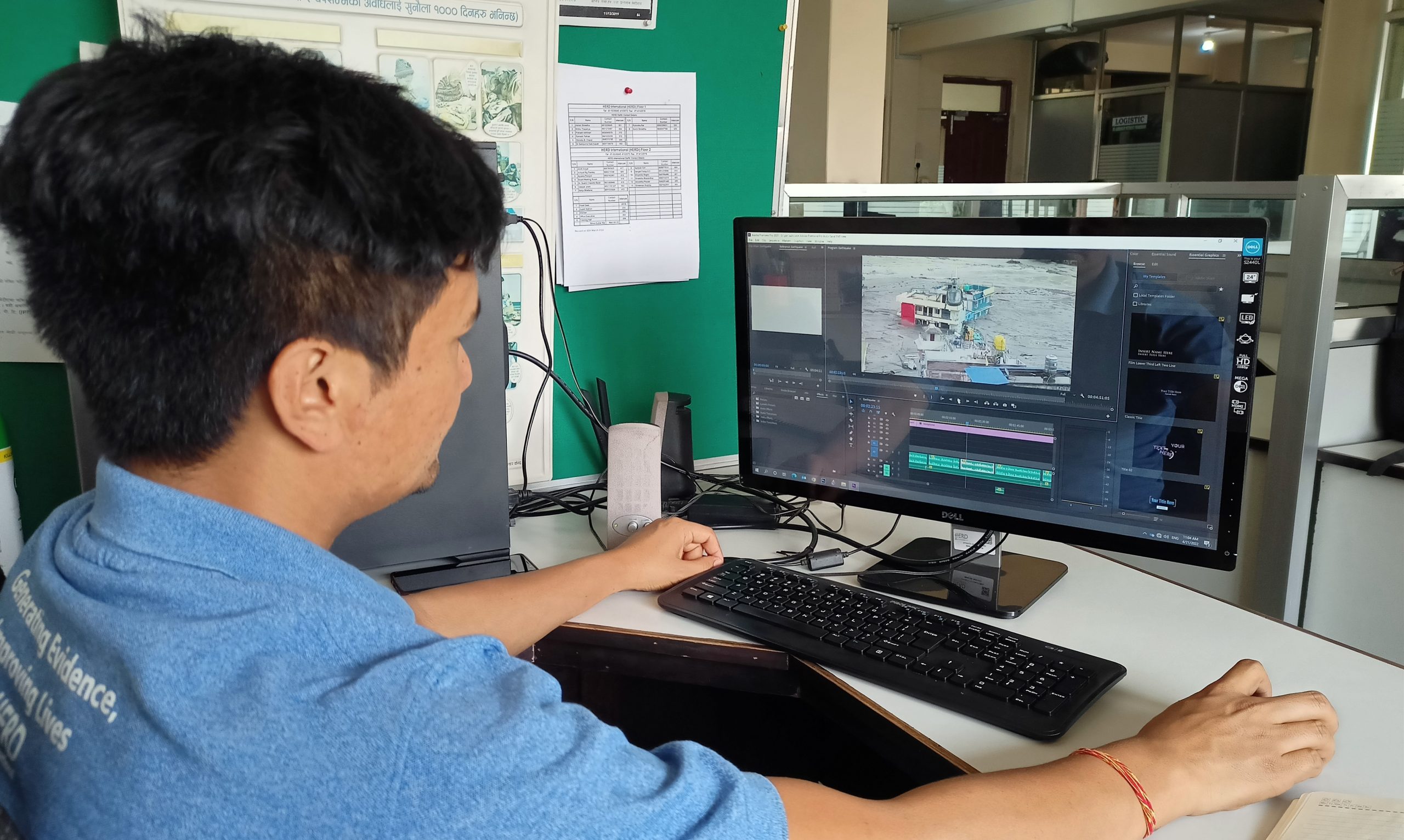 The HERD International audio visual communication officer, Ashim Shrestha, editing the earthquake section of the new Nepali-language video