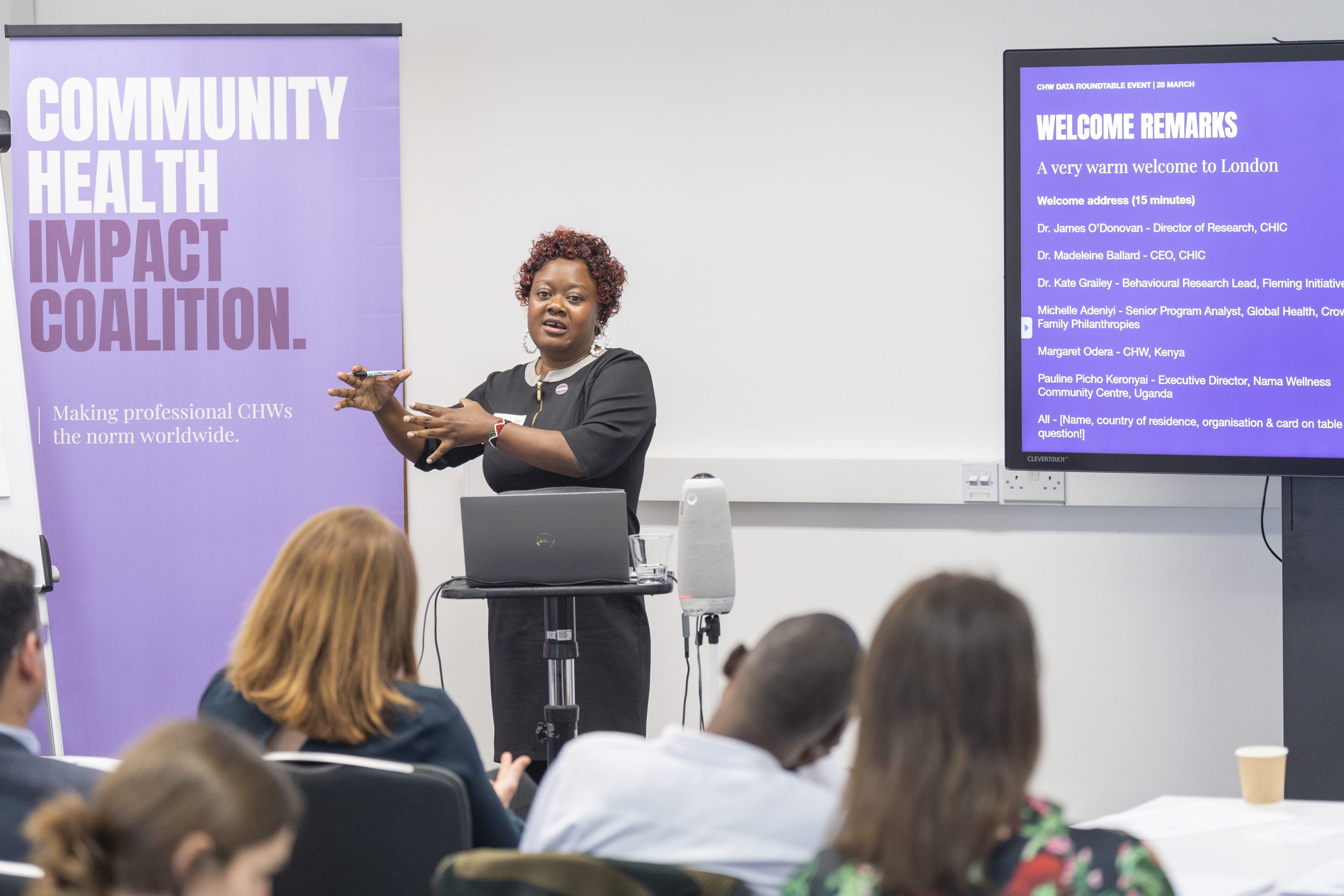 Woman stands talking to a seated room of people. She's standing at a laptop while behind her are a purple Community Health Impact Coalition banner and a screen outlining the session's running order
