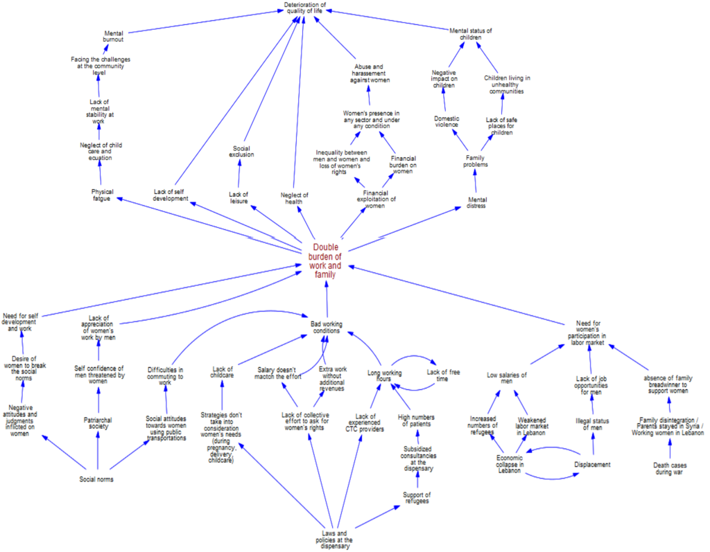It became clear that the women allocate greater importance to structural issues that cannot be easily modified at the community level, eg regulation of refugees’ work in Lebanon, exploitation and overworking, feeling excluded and unwanted by the Lebanese population etc, over problems directly related to gender, eg economic exploitation, the double responsibility of breadwinning and family care, and discriminatory gender norms in society at large.