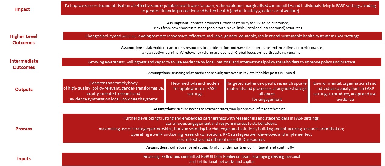The diagram shows how inputs and processes will lead to outputs, such as high-quality research, which will in turn contribute to growing awareness, willingness and capacity to use evidence by local, national and international policy stakeholders. This will then contribute to changed policy and practice, leading to stronger and more resilient health systems, and ultimately improve access to and use of effective and equitable health care by people living in fragile and shock-prone settings.