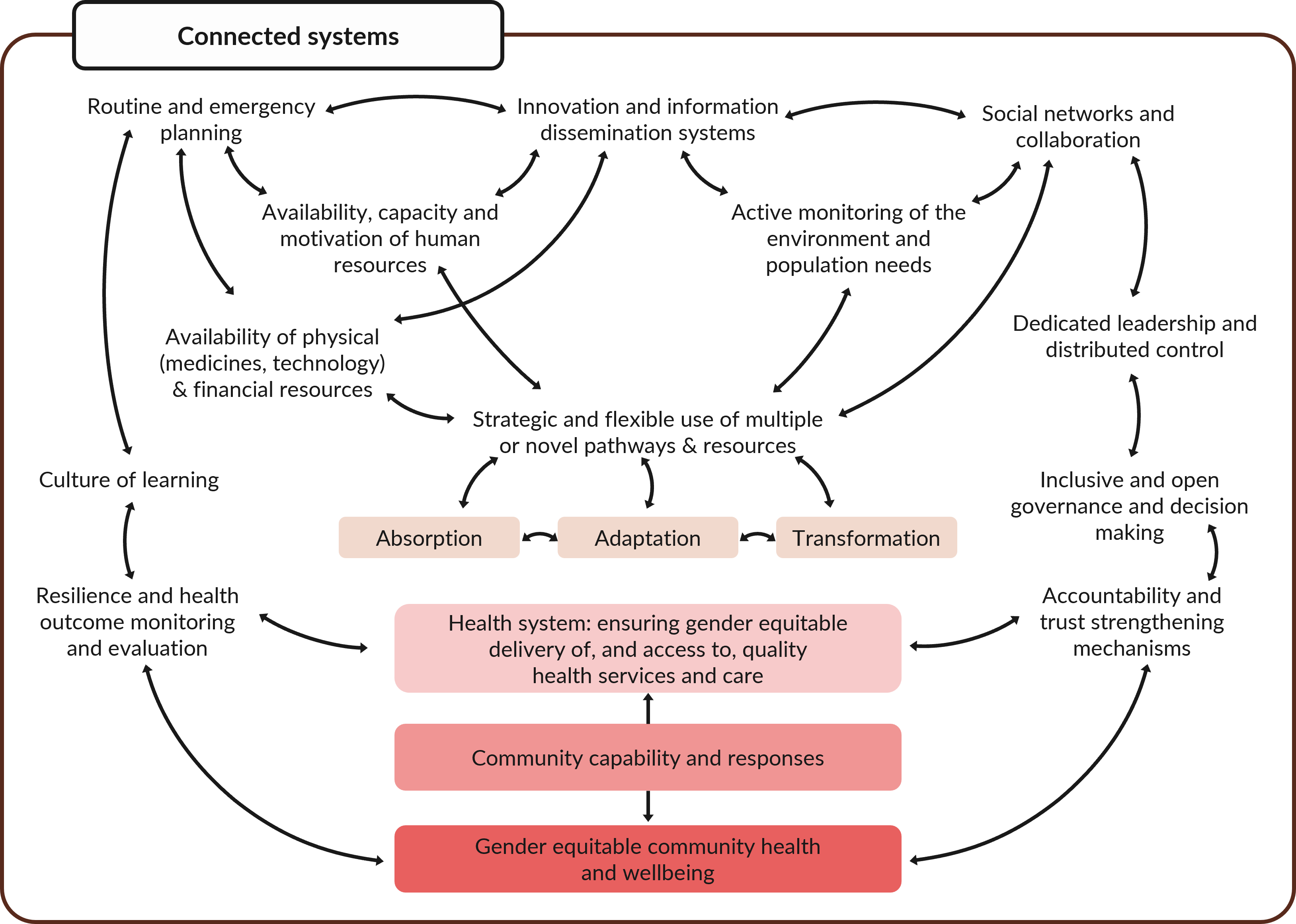 As our research progresses we are regularly re-evaluating this framework. This latest iteration is more explicit than the previous version about the dynamic interactions between different capacities, and also builds in more recognition of the critical interaction of community and health system. In addition, in recognition that the health system is not closed but is in constant interaction with the wider economy, the global environment etc, we have added a connection to wider context of public and private systems.