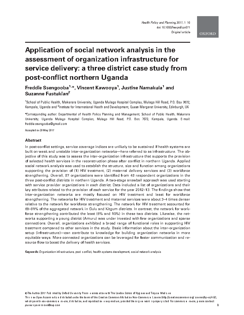 Application of social network analysis in the assessment of organization infrastructure for service delivery: a three district case study from post-conflict northern Uganda