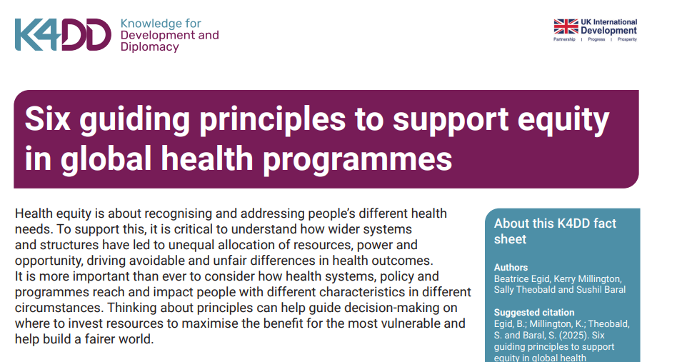 This K4DD (Knowledge for Development and Diplomacy) Fact Sheet [opens new tab] shares six guiding principles to support equity in global health programmes. It features contributions from ReBUILD members Sally Theobald from LSTM and Sushil Baral from HERD International, and references several ReBUILD publications.
