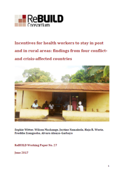 This working paper presents a cross-cutting analysis of ReBUILD’s research into health worker incentives in four post-crisis settings (northern Uganda, Sierra Leone, Cambodia and Zimbabwe) to understand the context, system and personal factors which helped to motivate and retain them in public or private not-for-profit service.