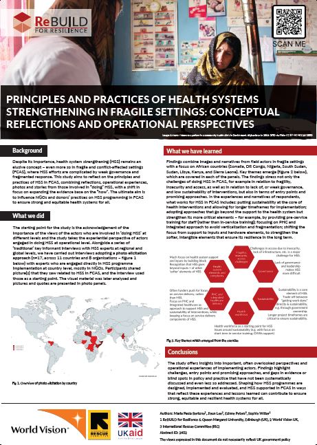 Despite its importance, health system strengthening (HSS) remains an elusive concept – even more so in fragile and conflict-affected settings (FCAS), where HSS efforts are complicated by weak governance and fragmented response. This study on which this poster is based, aims to reflect on the principles and practices of HSS in FCAS, combining reflections, operational experiences, photos and stories from those involved in “doing” HSS, with a shift in focus on expanding the evidence base on the “how”. The ultimate aim is to influence NGOs and donors’ practices on HSS programming in FCAS to ensure strong and equitable health systems for all.