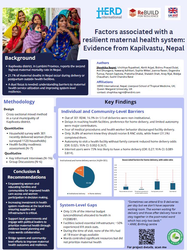 Shophika Regmi from HERD International spoke at the 11th National Summit of Health and Population Scientists in Nepal in April 2025. She presented a poster from a study at the team’s second Learning Site in Kapilvastu district in Lumbini Province, Nepal.
