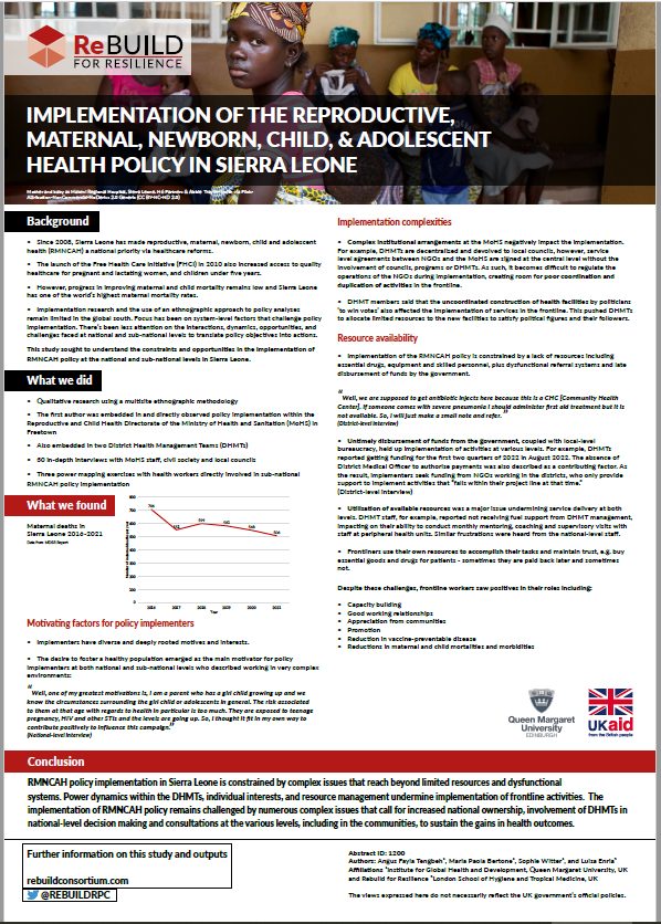 It summarised the study – The implementation of the reproductive, maternal, newborn, child, and adolescent health policy in Sierra Leone: dynamics, challenges, and opportunities faced by policy implementers at the national and sub-national levels.