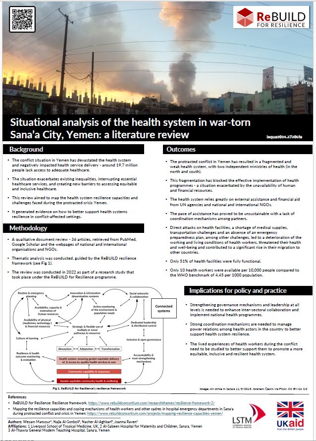 The poster presents the finding of a literature review which aimed to map the health system resilience capacities and challenges faced during the protracted crisis in Yemen. It generated evidence on how to better support health systems resilience in conflict-affected settings.