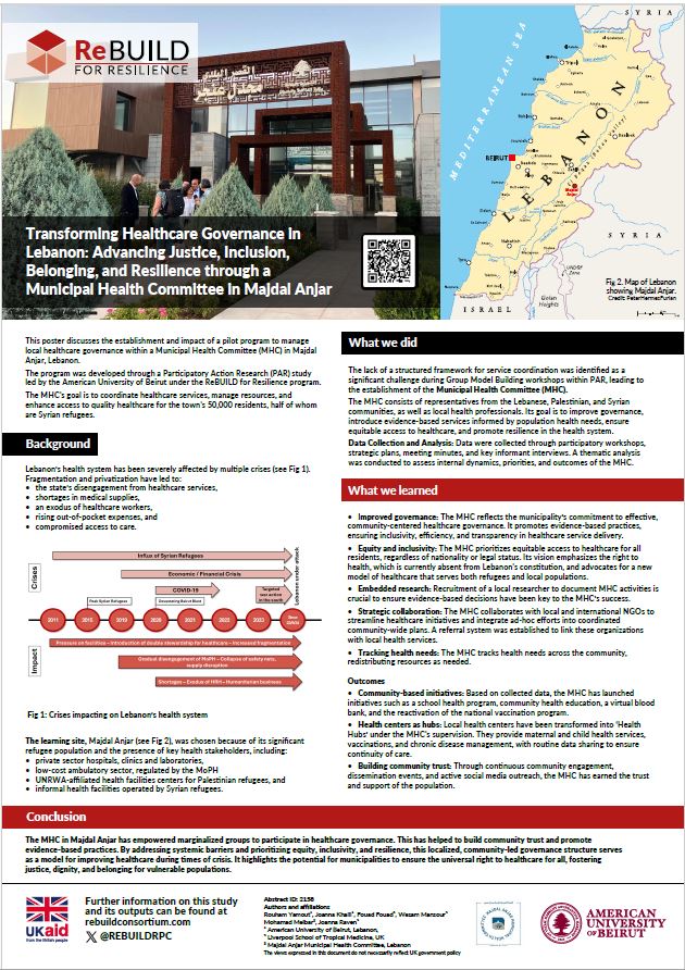 This poster discusses the establishment and impact of a pilot program to manage local healthcare governance within a Municipal Health Committee (MHC) in Majdal Anjar, Lebanon. The program was developed through a Participatory Action Research (PAR) study led by the American University of Beirut under the ReBUILD for Resilience program. The MHC’s goal is to coordinate healthcare services, manage resources, and enhance access to quality healthcare for the town’s 50,000 residents, half of whom are Syrian refugees