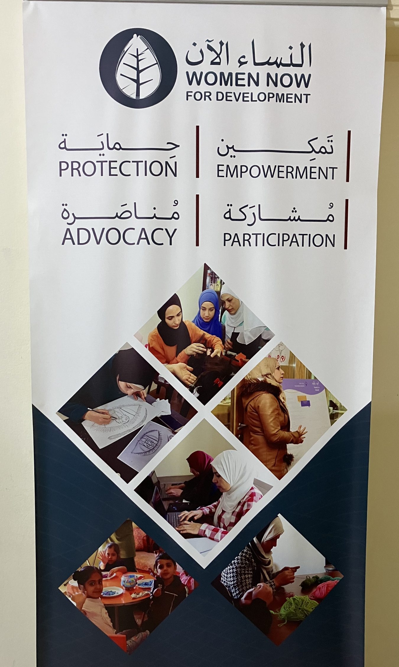 A pop-up banner with the words 'Women Now for Development' and images of Muslim women engaged in activities